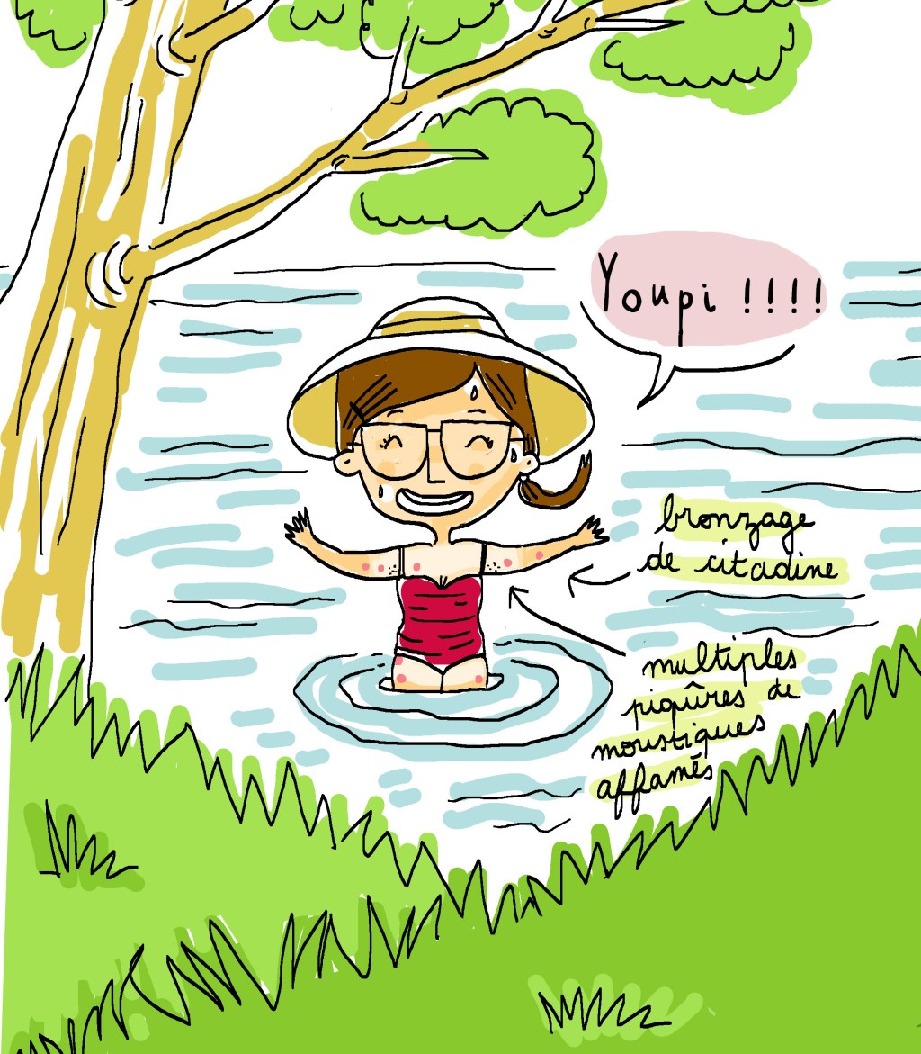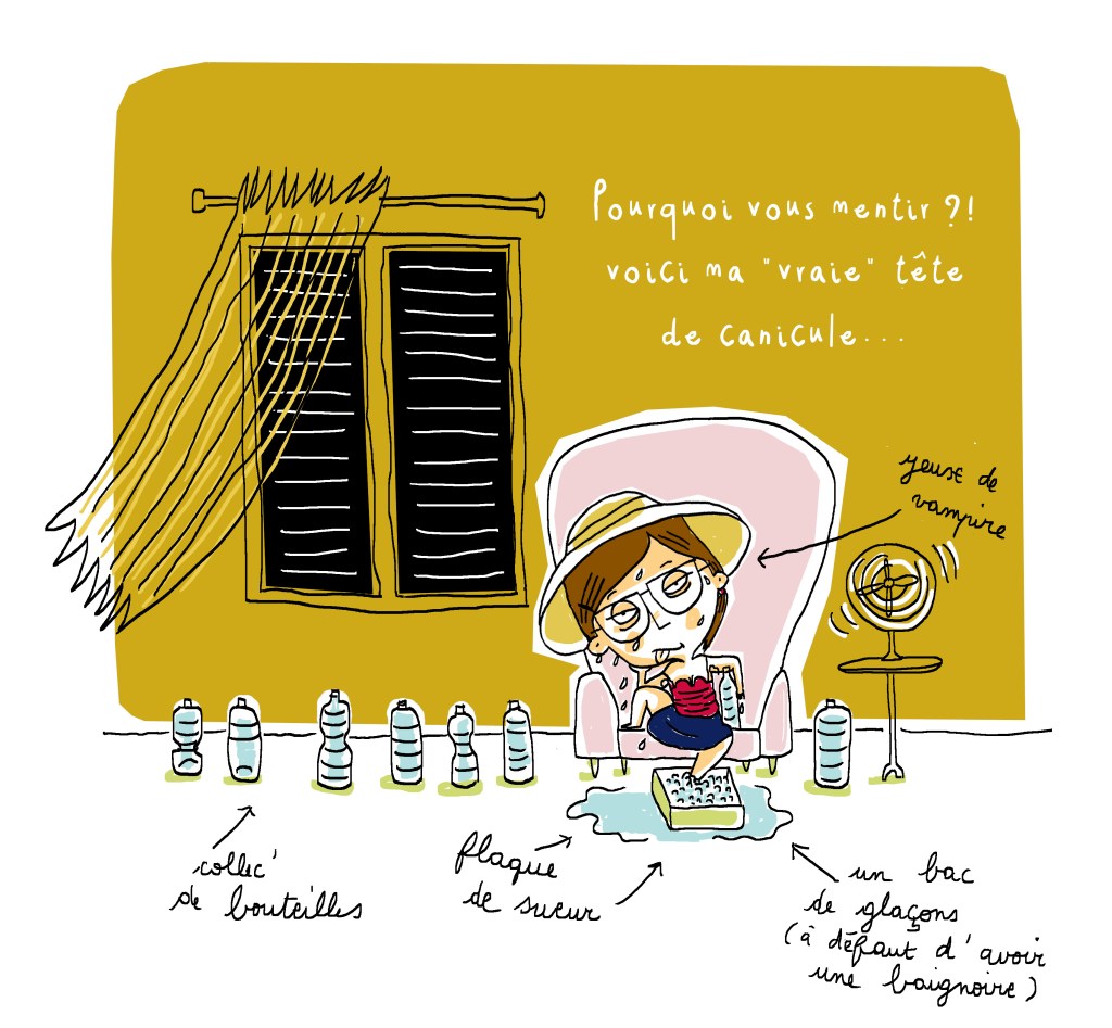 Ce qui se traduit ainsi au quotidien : à chaque fois que j’essaie de dessiner, pleine de bonne volonté, que ce soit à 8h ou à 2h du matin, au bout de 5 minutes, ma tablette se colle à mon avant-bras et mon stylet glisse entre mes doigts. Efficacité zéro. Donc en attendant le retour d’une température plus raisonnable et d’un air plus respirable, voici notre plan anti-canicule ! Au fait, n’oubliez pas de vous hydrater !