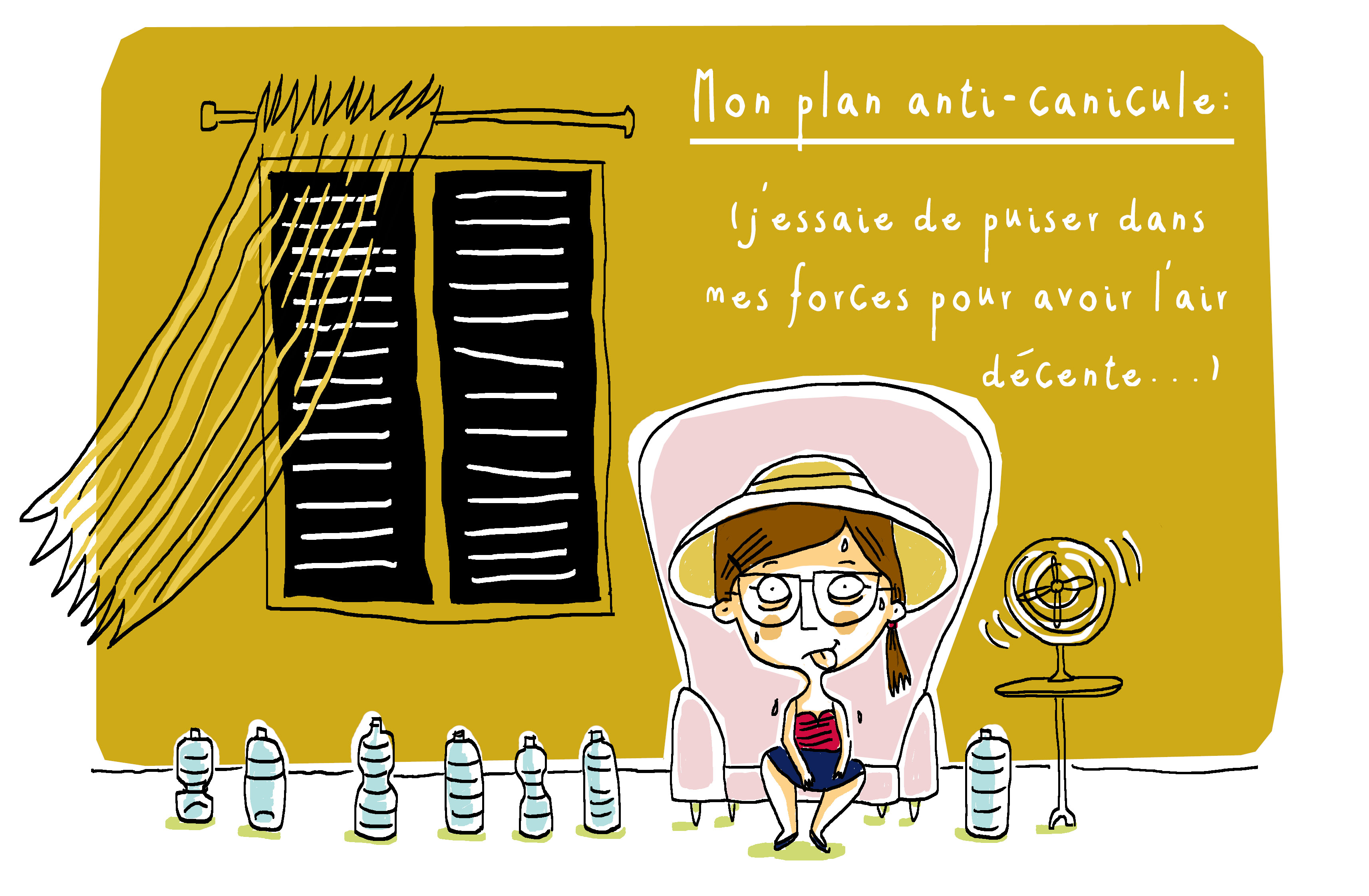 Ce qui se traduit ainsi au quotidien : à chaque fois que j’essaie de dessiner, pleine de bonne volonté, que ce soit à 8h ou à 2h du matin, au bout de 5 minutes, ma tablette se colle à mon avant-bras et mon stylet glisse entre mes doigts. Efficacité zéro. Donc en attendant le retour d’une température plus raisonnable et d’un air plus respirable, voici notre plan anti-canicule ! Au fait, n’oubliez pas de vous hydrater !